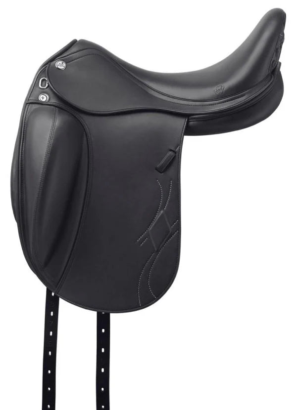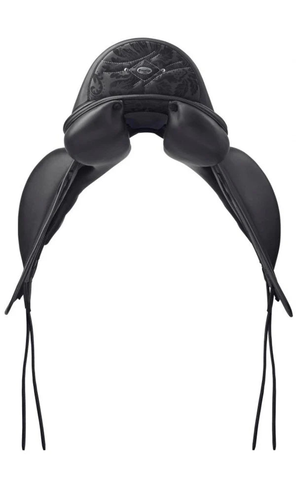 The saddle is built on a tree featuring the CPS technology, that takes into account both the male and female anatomy. The rider position is deep to provide a feeling of being very close to the horse, but without blocking its movements. The blocks are also innovative, following the anatomy of the horse, and are also available on Velcro. The back of the cantle and the channel between the panels are lined with damask leather. The anatomically conformed panels guarantee maximum freedom of movement for the trapezius muscles. Thanks to the larger rear part of the saddle tree, the panels also have a larger contact surface and therefore guarantee better weight distribution.